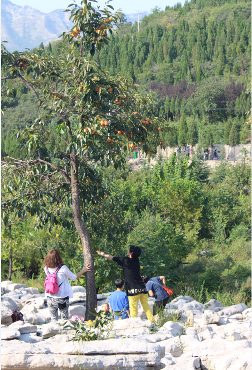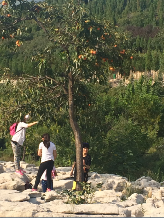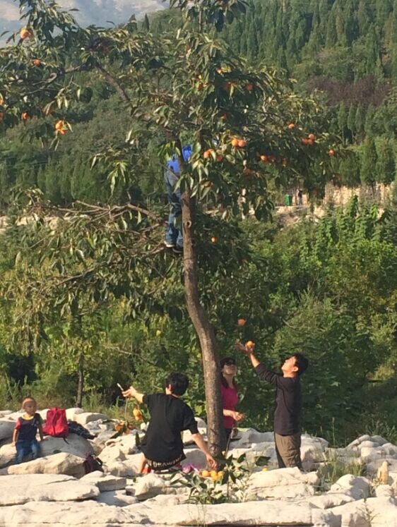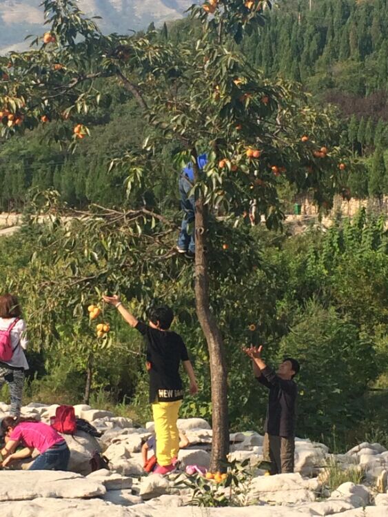 当我们玩的累的时候,一起坐在一个石头上休息。顺眼望去,有意思的事发生了。景区里有几颗“柿子树”,树上长满了柿子,硕果累累,一眼望去非常好看,刚开始好都人在柿子树下拍照留影。