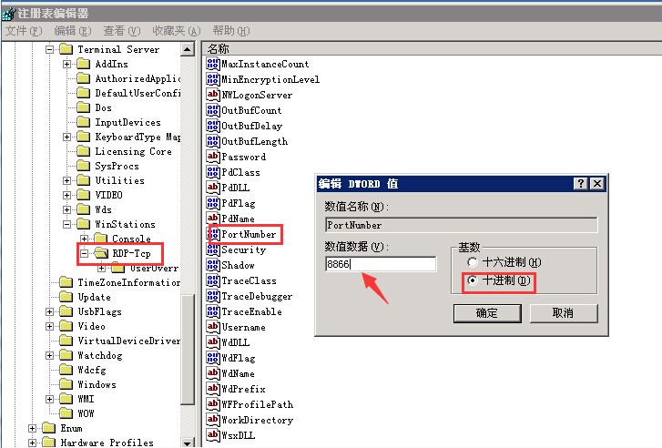 [HKEY_LOCAL_MACHINE\SYSTEM\CurrentControlSet\Control\Terminal Server\Wds\rdpwd\Tds\tcp] 右边的PortNumber键值 [HKEY_LOCAL_MACHINE\SYSTEM\CurrentControlSet\Control\Terminal Server\WinStations\RDP-Tcp] 右边的PortNumber键值